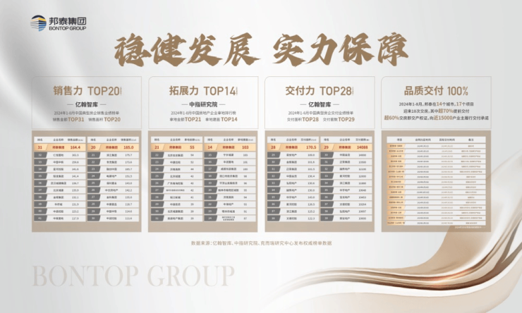 品牌有实力房企稳健运营TOP10,信得过的实力开发商。邦泰集团历经17年稳健开展,进驻全国34座城市,累计开发超130个精品项目,超2500万方开发面积。 逆势热销力全国房企出售排行榜TOP20,逆势热销民企。2024年1-8月出售面积排行全国房企TOP20,出售权益金额全国TOP23。成都天府云璟项目2024上半年单盘排行成都出售额TOP9,热销全城。 雄厚资金力23年拿地面积全国TOP13,24年1-8月拿地面积全国TOP14。在成都商场23年末接连斩获成华、天东地块,均为版块新晋地王,展现邦泰雄厚资金实力。 抢先交给力全国0逾期交给,超50%项目可提早交给。2024年1-7月,邦泰在14个城市,17个项目,迎来18次交房,其间超70%提早交给,超60%交房即交证,向近15000户业主实行交给许诺。